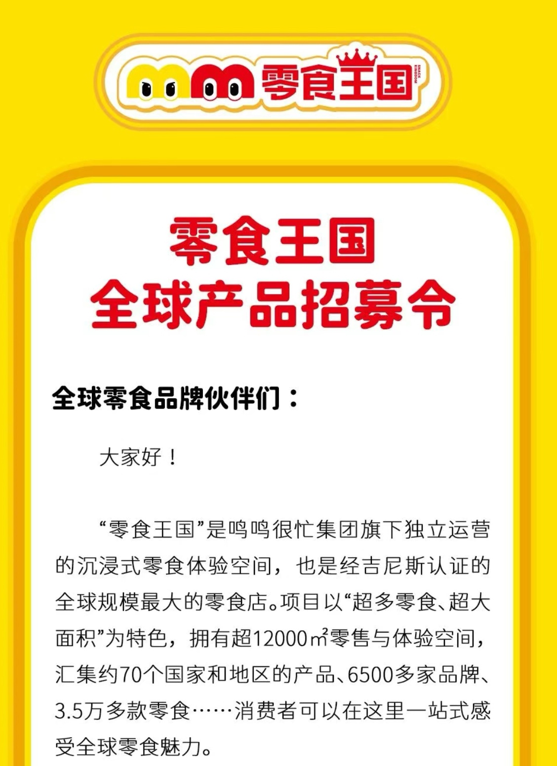 4月17日,记者获悉,鸣鸣很忙集团旗下独立运营的全新沉浸式零食体验空间“零食王国”发布《零食王国全球产品招募令》,将以开放平台的方式,长期面向全球零食品牌与食品工厂招募合作伙伴。