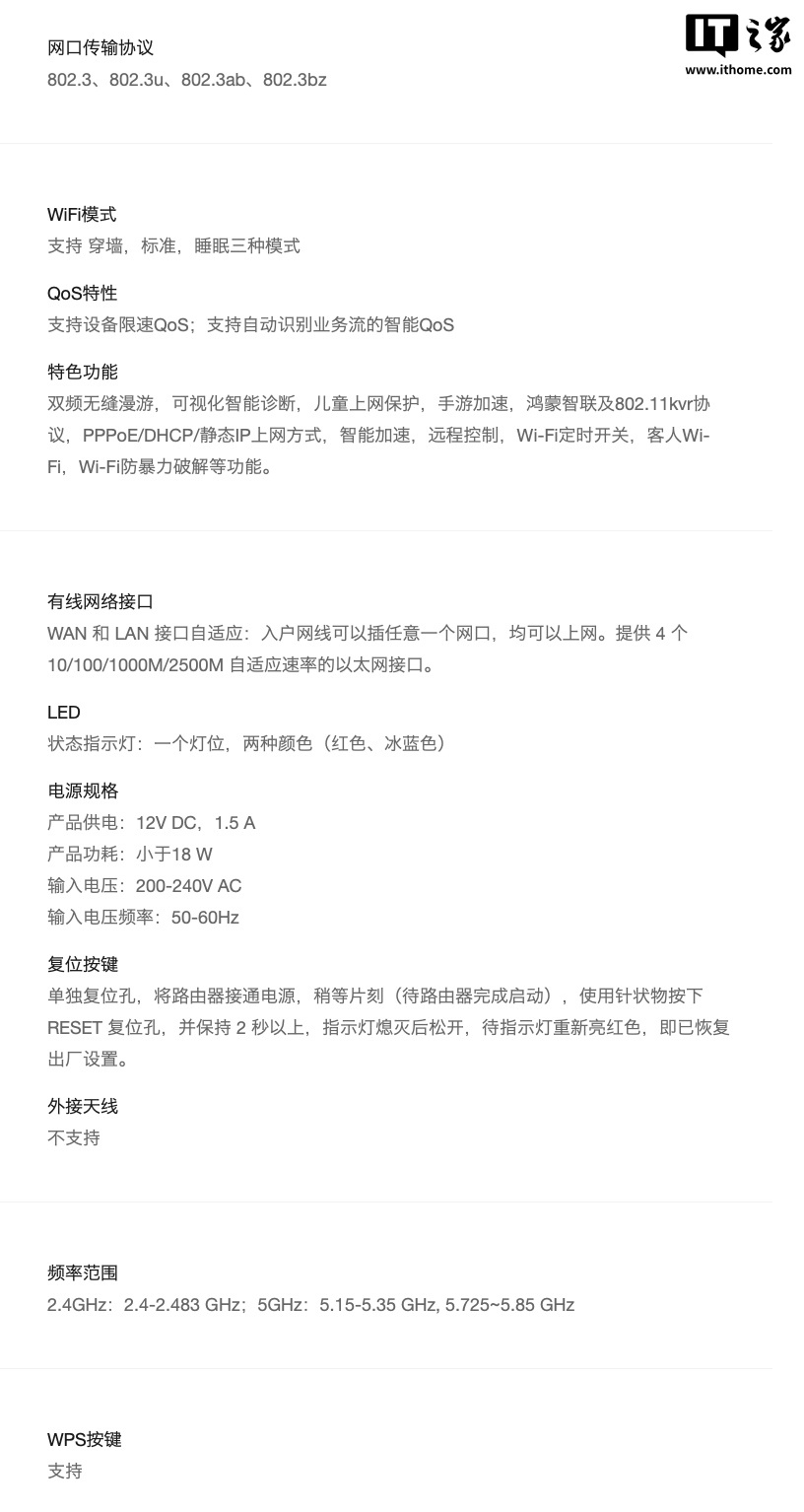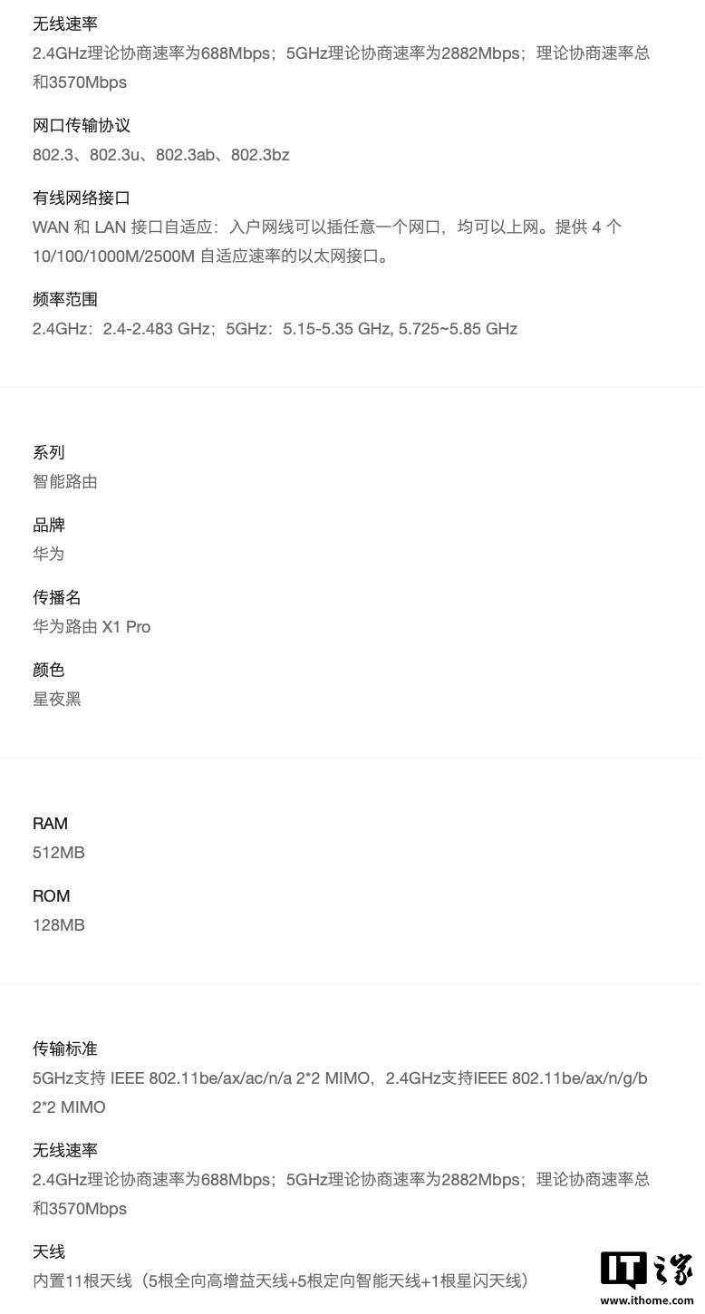 该路由器搭载灵犀天线(机身内置了 11 根天线),包括 5 根全向高增益天线、5 根定向智能天线和 1 根星闪天线,搭载了华为自研的智能天线算法,能够实时识别设备的位置和状态,并通过微秒级切换,动态调整天线阵列,使用最优的高增益天线组合进行信号传输。这种“雷达扫描式”的信号优化,确保了每个方向的用户都能获得高质量的网络体验,信号增益高达 6dB。